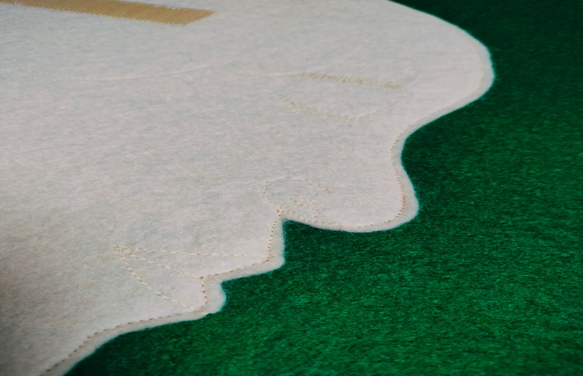 De groene achtergrond bestaat uit 5 mm dik vilt en is voorzien van zes metalen ringen in de hoeken en bovenrand, zodat de puzzel stevig kan worden opgehangen. In zijn totaliteit is hij 85cm breed en 120cm lang.