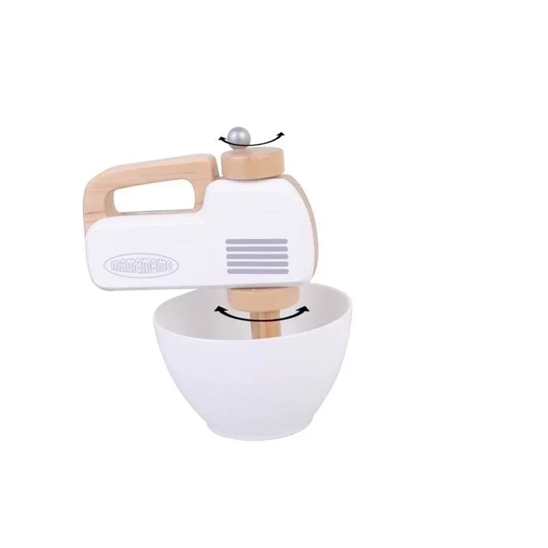 Een speelgoed handmixer met witte kom, gemaakt van duurzaam FSC hout. Door aan de knop te draaien gaan de gardes draaien. Adviesleeftijd 3+